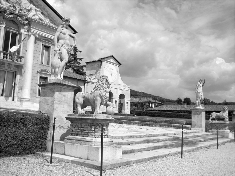 Asimismo, el carácter dialéctico arquitectura-paisaje se percibe en el diseño de las aberturas de las fachadas y de los arcos que, como lugares de transición entre el espacio interior y el exterior, fueron soluciones utilizadas por Palladio para controlar visualmente tanto las trasparencias de las intersecciones que articuló entre los espacios como la visual del vasto territorio de la llanura véneta. Así, reconstruyó el discurso antiguo sobre las vistas escenificadas arquitectónicamente de lugares naturales; por ello, las vistas de la tierra, la perspectiva del paisaje circundante y el jardín son una característica particular de sus villas, las cuales están enmarcadas por medio de las ventanas, las puertas y los arcos. Así, el locus palladiano enfatiza en la villa el valor de la elección del lugar, las condiciones y cualidades del espacio arquitectónico y la topografía del sitio específico hecho de elementos naturales y artificiales, donde la villa enmarca y define el paisaje existente.50
