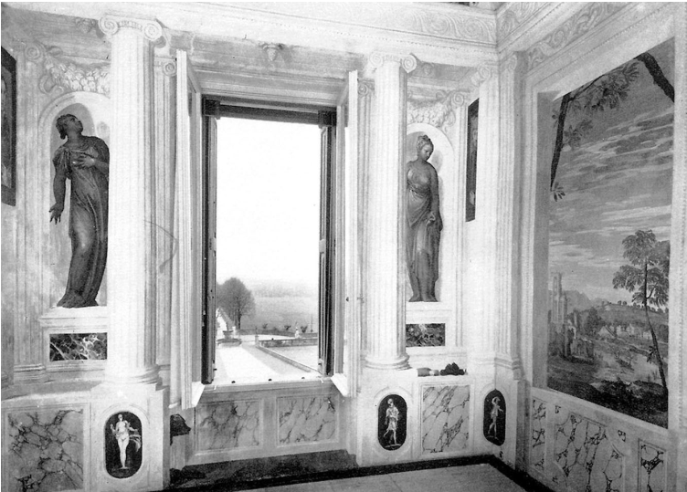 Ahora bien, la decoración interna de los frescos en la Villa Barbaro pone de manifiesto la interpretación de Veronese del repertorio clásico-humanista de la pintura mural respecto a la representación de la naturaleza y la perspectiva geométrica para crear un programa que uniera arquitectura y pintura.51 Los frescos de las habitaciones del piano nobile de la villa se caracterizan por la aplicación de la concepción clásica de la belleza en la composición pictórica con las diversas escenas y los paisajes encuadrados en los elementos arquitectónicos pintados y su unificación en un todo. A partir de ello, Veronese le confirió una profundidad ilusoria a la superficie, lo cual parece romper los límites de ésta, haciendo de los frescos los determinantes del espacio. Así, el espacio virtual se integra al real simulando la existencia de un espacio único y estableciendo un diálogo, a su vez, con las perspectivas del paisaje del Véneto que se perciben a través de las ventanas (Figura 9).