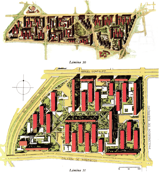 [la Unidad Independencia] Toma como ideal rector la Carta de Atenas [CIAM IV, 1933], para proveer la suficiencia de los servicios municipales. El aprovechamiento de los espacios verdes, la ubicación adecuada de la relación trabajo-habitación, la proximidad necesaria de los centros de contacto social -el mercado, el cine, la plaza, la escuela, la clínica- y el aislamiento imperioso de las vías de circulación a efecto de evitar cruzamientos riesgosos de vehículos y peatones.27