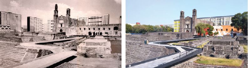 En la actualidad se pueden ver -y sentir- los vacíos de los edificios colapsados; así mismo se percibe la tragedia en el monumento a los caídos del 68, y la barbarie de la colonización española con los pueblos aborígenes.24 La propia implantación y abrazo de los edificios coloniales y modernos, sin consideración alguna a las ruinas prehispánicas, manifiestan otra especie de imposición y de barbarie, pero bien lo expresaría Walter Benjamin: “No hay documento de cultura que no lo sea al tiempo de barbarie”. En el lugar se perciben las mutilaciones físicas y las ausencias de personas caídas durante los genocidios. Estos eventos resultan como cicatrices inmanentes que se sienten en el ambiente, nos hablan de tiempos y de circunstancias trágicas acaecidas (Figura 8).
