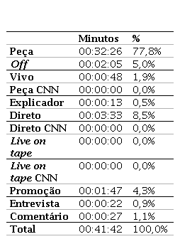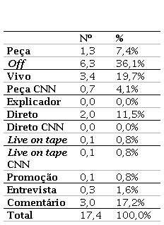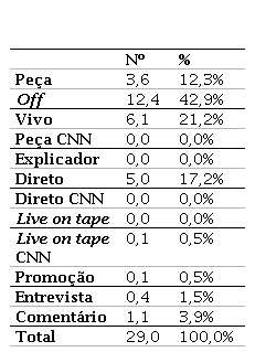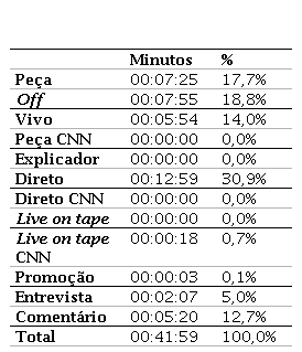 Por sua vez, os dados do CNN Fim de Tarde (Tabelas 6 e 8) revelaram um aumento deste tipo de segmentos em relação ao CNN Novo Dia (Tabelas 2 e 4). Apesar de também não se ter encontrado qualquer “direto CNN”, voltou a registar-se o segmento “live on tape CNN” (ainda que sensivelmente com os mesmos valores baixos do CNN Novo Dia) e encontraram-se dados significativos sobre o segmento “peça CNN”. Apesar de corresponder apenas a 0,7 da média de 17,4 dos segmentos por jornal, corresponde a 4,1%, acima da “entrevista”, por exemplo, o que corresponde a três minutos e 18 segundos da média de 56 minutos da duração do jornal, ou seja, 5,9%. Estes dados são superiores aos registados no segmento “peça” e “vivo” e pouco abaixo dos do segmento “off”, no que toca (apenas) ao tempo.
