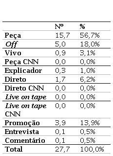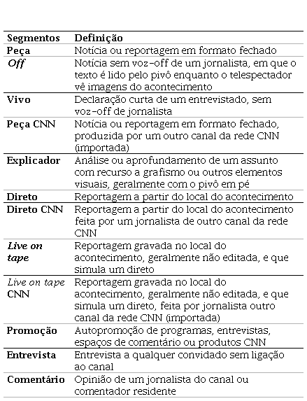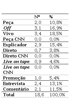 Para identificar as eventuais diferenças entre estilo e composição de cada noticiário foram contabilizados o número de elementos emitidos em cada, doravante designados por “segmentos”, ou seja, se se trata de uma peça, um vivo, um direto, entre outros, de acordo com a Tabela 1.