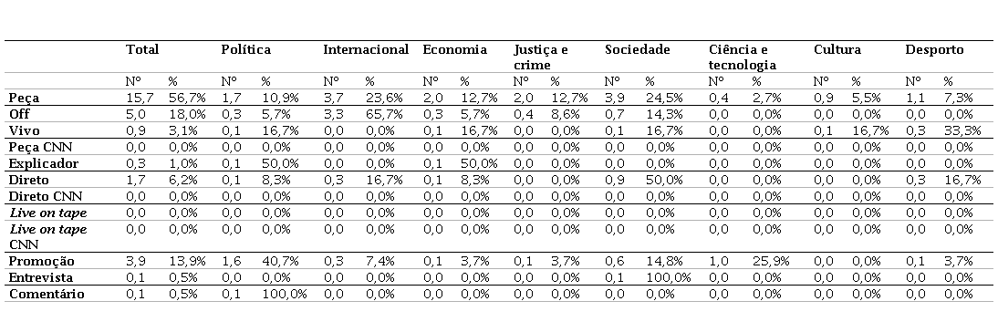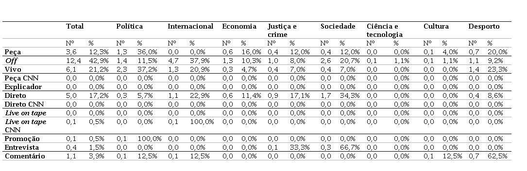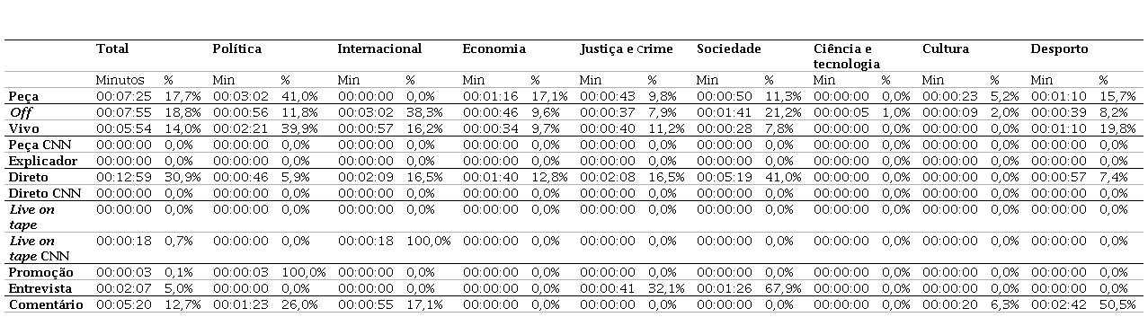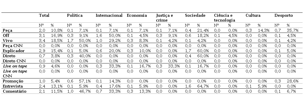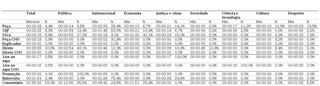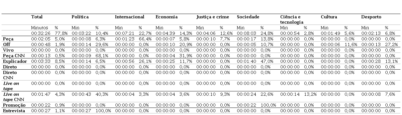 CNN Novo Dia (Tabela A1): sociedade 10; política 9; internacional 7; desporto 7; justiça e crime 5; economia 4; cultura 1; ciência e tecnologia 0.