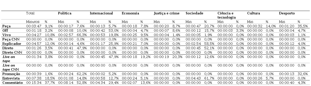 Apesar de os segmentos “peça”, “off”, “vivo”, “peça CNN”, “direto”, “live on tape” e “live on tape CNN” representarem 80,4% dos segmentos (Tabela 6), 13,9 dos 17,4, estes ocupam apenas cerca de 19 minutos dos 56 de média de duração (Tabela 8), ou seja, 33,6% do jornal. Desta vez, os segmentos “entrevista” e “comentário” (não se encontrou o segmento “explicador”) representam 66,4% do tempo, ou seja, 37 minutos dos 56, apesar de corresponderem apenas a uma média de 3,3 segmentos por jornal, ou seja, 18,8%, sendo que o “comentário” ocupa a esmagadora fatia das somas: 17,2 dos mesmos 18,8% dos segmentos e 63 dos 66,4% do tempo de jornal. A leitura dos dados sugere, assim, que é um noticiário que dá mais espaço à análise e ao comentário dos assuntos do dia, semelhante ao jornal das 9:00 da CNN Prima News (Tabelas 3 e 5) e um oposto do jornal das 19:00 do canal checo (Hlavní Zprávy), como se vai demonstrar.