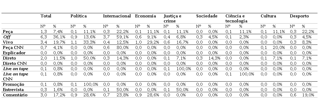 CNN Fim de Tarde (Tabela A3): política 18; internacional 17; economia 14; desporto 3; justiça e crime 2; cultura 1; sociedade 1; ciência e tecnologia 1.