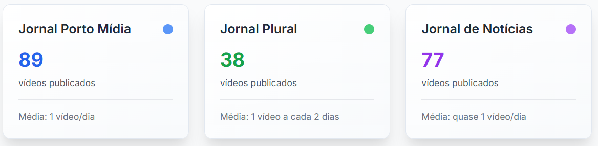 O Jornal Porto Mídia apresentou médias mais modestas de engajamento (350 curtidas e 6 comentários por vídeo), o que reflete seu perfil hiperlocal e o alcance naturalmente mais restrito da sua audiência. Embora a literatura aponte que veículos locais costumam enfrentar limitações estruturais e de recursos (Abernathy, 2018; Nielsen, 2015), este estudo não investigou diretamente as condições organizacionais da redação, de modo que tais fatores são aqui mencionados apenas como contexto teórico mais amplo.