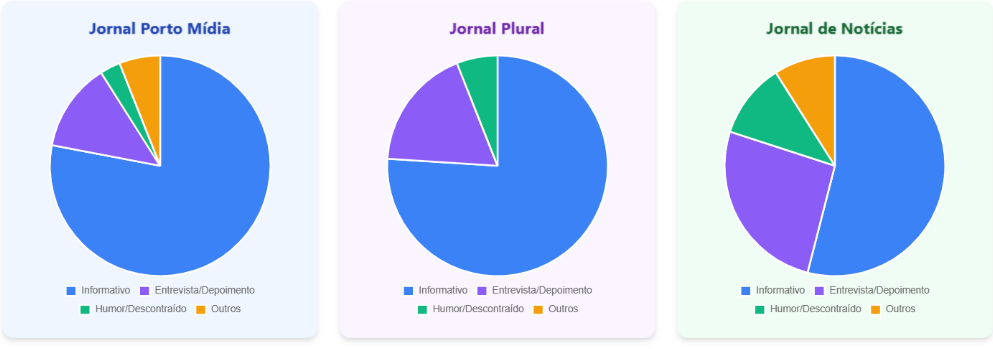 A Tabela 1 apresenta a distribuição detalhada dos tipos de conteúdo em cada veículo, permitindo observar contrastes entre ênfases editoriais, como a centralidade da cobertura policial no Jornal Porto Mídia, a ênfase em política e cultura no Jornal Plural e a forte presença de conteúdos internacionais no Jornal de Notícias.