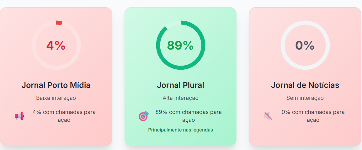 A interação com o público foi limitada nos perfis analisados, sobretudo no que diz respeito ao uso de chamadas para ação (CTA, do inglês call to action) e à ausência de respostas a comentários. Como mostra a Figura 3, o Jornal Plural incorporou CTA em 89% de seus vídeos — frequentemente nas legendas, com expressões como “comente abaixo” ou “partilhe esta notícia”. Já o Jornal Porto Mídia utilizou esse recurso em apenas 4% de seus vídeos, enquanto o Jornal de Notícias não apresentou nenhuma ocorrência desse tipo.