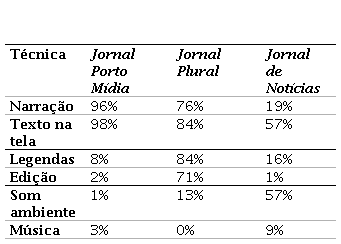 A análise das técnicas audiovisuais revelou um conjunto variado de recursos empregados pelos perfis (Tabela 2). Além das categorias clássicas discutidas na literatura — como legendas, edição e narração — observou-se também a presença de elementos recorrentes no TikTok, como uso de música, som ambiente e inserção de texto na tela. O Jornal Plural se destacou pelo uso de edições dinâmicas e legendas frequentes, enquanto o Jornal Porto Mídia manteve estilo simples. Já o Jornal de Notícias apostou em conteúdos espontâneos, com uso intenso de som ambiente (57%) e de material gerado por usuários.