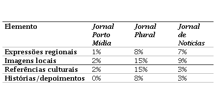 Os elementos de proximidade considerados neste estudo — expressões regionais, imagens locais, referências culturais e histórias/depoimentos — correspondem ao que Hess e Waller (2017) classificam como dimensões culturais e afetivas da proximidade (Tabela 3). Entre os veículos, o Jornal Plural foi o que mais incorporou esses elementos, com destaque para referências culturais e imagens locais (15% cada).
