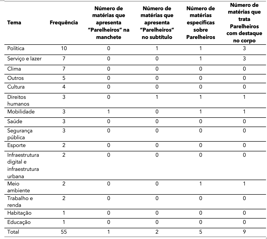 A análise (Tabela 4) evidencia que, embora os veículos tenham abordado 15 temas, o território recebeu pouco destaque na cobertura jornalística. Das suas 55 matérias selecionadas, apenas cinco eram específicas sobre Parelheiros, uma apresenta Parelheiros na manchete, duas no subtítulo e nove destacam o território no seu corpo.