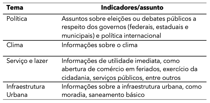 Além disso, para a análise, foram acrescentados quatro temas (Tabela 2) que não constam do relatório mencionado anteriormente. Apesar de não constar no Mapa da Desigualdade, esses temas são bastante recorrentes nas matérias analisadas e diferentes entre si, portanto, seria mais limitado analisá-los conjuntamente apenas como “outros” temas.