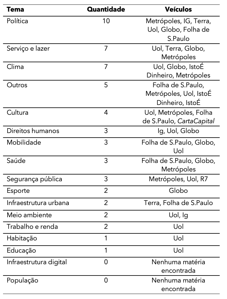 Inicialmente, observa-se que os órgãos de comunicação apresentaram maior frequência de matérias na categoria de política (10), seguida por serviço e lazer (sete), clima (sete), outros (cinco) e cultura (quatro). Com menor incidência, as categorias direitos humanos, mobilidade, saúde e segurança pública registraram três matérias cada. Já as categorias de esporte, infraestrutura digital e infraestrutura urbana, meio ambiente e trabalho e renda tiveram duas matérias cada, enquanto habitação e educação apareceram apenas uma vez.