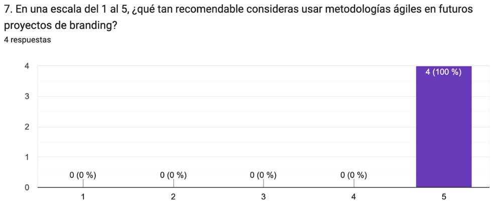 Finalmente, el 100% de los estudiantes calificó con la máxima puntuación (5/5) la recomendación de utilizar metodologías ágiles en futuros proyectos de branding. Esto evidencia una aceptación total y sostenida de estas metodologías (Figura 11).