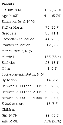 Participants were 214 parents with a mean age of 41.1 years (SD = 5.79), of whom 87.9% were women. The predominant educational level in the sample is graduate (41.1%). Most were married (86.4%), with a predominant socioeconomic income level between 2,000 and 2,999 euros per month (29.7%). The children were aged between 3 and 17 years (M = 7.78, SD = 3.78), and 46.3% were girls (Table 1). The age of children showed the following quartile distribution: Q1 = 4.0 (years), Q2 = 7.0 (years), Q3 = 10.0 (years).