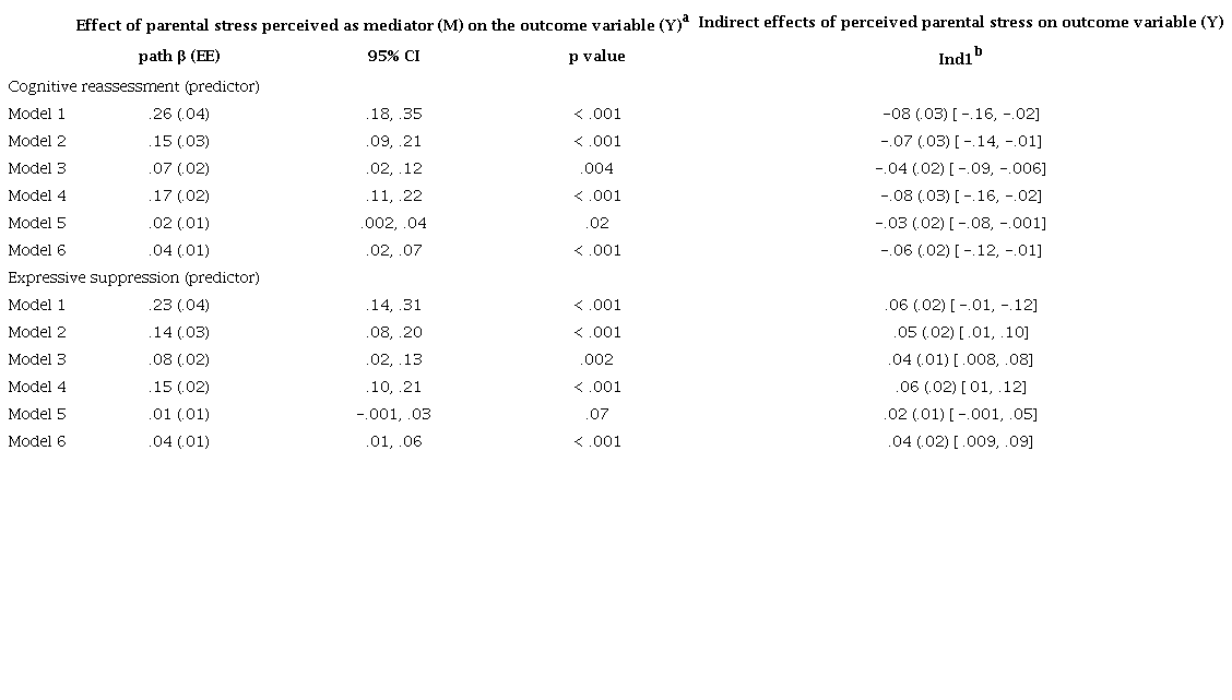 The possible mediating role of parental stress in the relationship between parents’ emotion regulation (cognitive reappraisal and expressive suppression) and their children’s psychological symptoms during the COVID-19 pandemic was studied. There were 12 mediation models estimated, considering two possible predictors (cognitive reappraisal and expressive suppression) and the six psychological symptom factors as outcome variables (anxiety symptoms, mood disturbances, sleep problems, behavioral problems, eating alterations, and cognitive alterations). Perceived parental stress was the mediator (M). Mediation models were estimated with the macro PROCESS v.4.0 (Hayes, 2013; Preacher & Hayes, 2008) for SPSS. The children’s and parents’ ages and the gender of the children and the reporting parent were included as covariates. The asymmetric confidence interval (CI) was based on the bootstrap method with 5,000 repetitions, and the significance criterion was p ≤ .05. The α path shows the relationship between parents’ emotion regulation and perceived parental stress. The β path shows the relationship between perceived parental stress and their children’s psychological symptoms. When zero was not included in the CI of indirect effects, mediation was accepted. Data were analyzed with SPSS v2 7.00 for Windows.