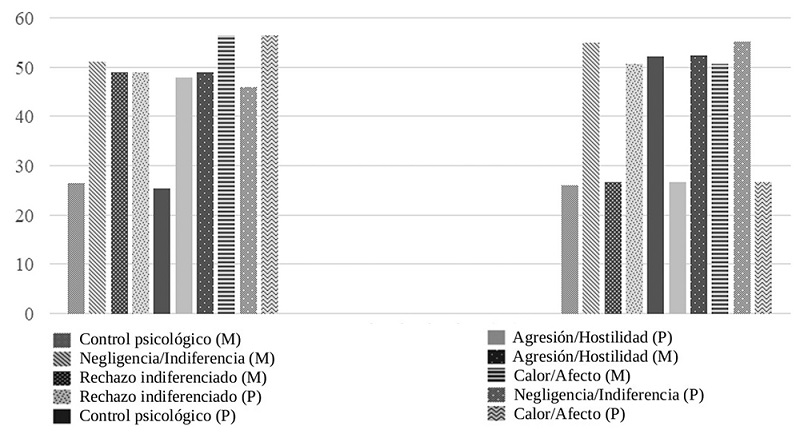 En la Figura 1 se representa un diagrama de barras con las diferentes dimensiones del PARQ; percepción del padre y de la madre por separado agrupadas según los dos conglomerados resultantes del análisis: grupo de rechazo-parental y grupo de aceptación-parental.