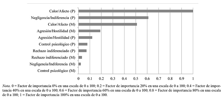 Se encontraron diferencias significativas en todas las dimensiones del PARQ en ambos grupos, tanto en la percepción de la figura del padre como de la madre. Además, atendiendo a los tamaños del efecto calculados con el estadístico eta cuadrado parcial (η2), se desprende que los factores más importantes en ambos conglomerados para ambos progenitores son: calor/afecto y negligencia/indiferencia del padre, y calor/afecto y agresión/hostilidad de la madre. La Figura 2 recoge las dimensiones ordenadas según la importancia de estos predictores en los dos conglomerados.