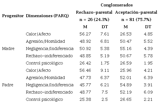 En la Tabla 1 se muestran los resultados descriptivos básicos para las diferentes dimensiones del instrumento PARQ (madre y padre) así como los tamaños muestrales en números absolutos y en porcentajes de los dos conglomerados obtenidos a través del análisis jerárquico. Los cuestionarios están codificados en la dirección del rechazo percibido, es decir, cuanto más alto es el puntaje en el cuestionario, más recuerdo de rechazo percibido. Cuanto más baja sea la puntuación, más recuerdo de aceptación percibida. Las puntuaciones oscilan entre 60 y 240. Puntuaciones iguales o superiores a 150 revelan la percepción de más rechazo que aceptación.