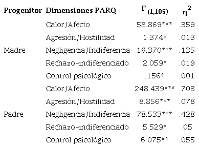 Para realizar el análisis de conglomerados se utilizó el método jerárquico, se seleccionó y calculó la distancia euclídea al cuadrado y se empleó el método de conglomeración de Ward (1963) para definir la estructura jerárquica de los datos. Se utilizaron los contrastes llamados comparaciones múltiples post-hoc (o a posteriori) mediante un análisis Bonferroni para saber qué media difería de otra, y se comprobó que los criterios de homogeneidad y normalidad eran significativos. También se midieron, a través de eta cuadrado parcial (η2), los tamaños de efecto (véase Tabla 2). Una vez definidos los dos conglomerados (aceptación y rechazo) se procedió a comprobar si había diferencias significativas en las dimensiones del PARQ. Para ello se realizó un MANOVA, utilizando como variables dependientes las cinco dimensiones (calor/afecto, agresión/hostilidad, negligencia/indiferencia, rechazo indiferenciado y control psicológico) en la percepción del padre y de la madre por separado.