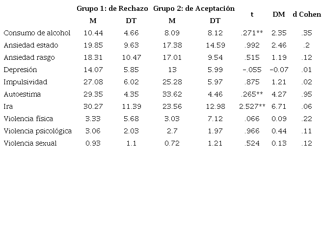 El segundo objetivo era analizar la existencia de diferencias entre los agresores en función de variables individuales a partir de la calidad de los lazos afectivos. Al comparar las medias de los dos clústeres en las diferentes medidas de este estudio se pudo observar que el grupo de rechazo presentaba puntuaciones significativamente más bajas en autoestima (tamaño del efecto alto) y más altas en expresión de la ira (tamaño del efecto moderado-alto), asumiendo parcialmente la hipótesis dos. Estos resultados son coherentes con estudios anteriores (Loinaz et al., 2012) que, a su vez, corroboran hallazgos de la literatura científica donde se afirma que las personas que perciben rechazo a lo largo de sus vidas tienden a desarrollar sentimientos de baja autoestima y bajo sentido de competencia o autoeficacia (Rohner y Carrasco, 2014). En relación con la autoestima, tal y como señalan Echeburúa et al. (2009), la violencia ejercida hacia las mujeres podría ser una forma de conseguir la estima que no consiguen de otra manera. Los maltratadores con baja autoestima suelen percibir en mayor medida las situaciones como amenazantes (Lila et al., 2012), hecho que también podría influir en manifestar una conducta violenta.