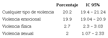 En relación con la prevalencia de la violencia, se encontró que los abusos emocionales son los más frecuentes en las participantes (19.9% vivió al menos un acto de violencia emocional) seguidos de los físicos (2.7%) y los sexuales (2%). En total, 20.2% de las adolescentes y jóvenes experimentó al menos una agresión de cualquier tipo en el último año (Tabla 2).