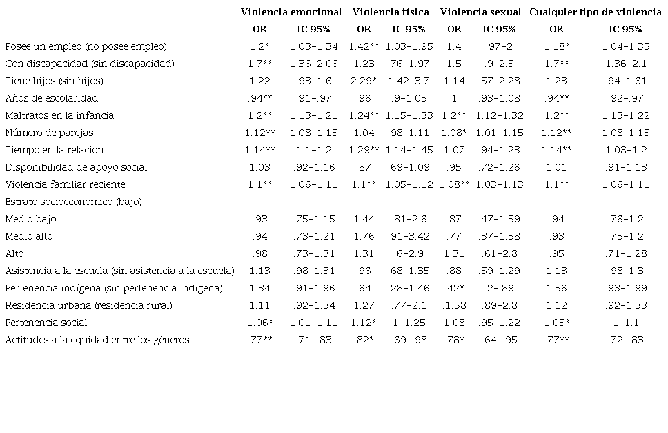 Al respecto, el riesgo de experimentar cualquier tipo de violencia se asoció con la mayoría de las variables de la historia individual de la participante. En este sentido, la probabilidad de vivir violencia aumenta con la condición de discapacidad (OR = 1.7, 95% CI [1.36 - 2.1]), los maltratos durante la infancia (OR = 1.2, 95% CI [1.15 - 1.24]), el tiempo en la relación (OR = 1.24, 95% CI [1.13 - 1.35]), el número de parejas (OR = 1.12, 95% CI [1.08 - 1.15]) y el trabajar (OR = 1.18, 95% CI [1.04 - 1.35]); en tanto, disminuye con la escolaridad (OR = .94, 95% CI [.92 - .97]).