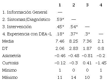 En la Tabla 1 se muestran los estadísticos descriptivos de las variables, así como la matriz de correlaciones de Spearman. De acuerdo con los valores de asimetría y curtosis, las variables objeto de estudio cumplen con los criterios de normalidad (valores por debajo de tres para la asimetría y por debajo de diez para la curtosis; Kline, 2011). Los resultados del análisis de correlación mostraron que el conocimiento real en las dimensiones de Información General, Síntomas/Diagnóstico e Intervención y la experiencia con alumnado con DEA-L correlacionaban positiva y significativamente, mostrando que, a mayor experiencia, mayor conocimiento sobre las dimensiones de la escala.