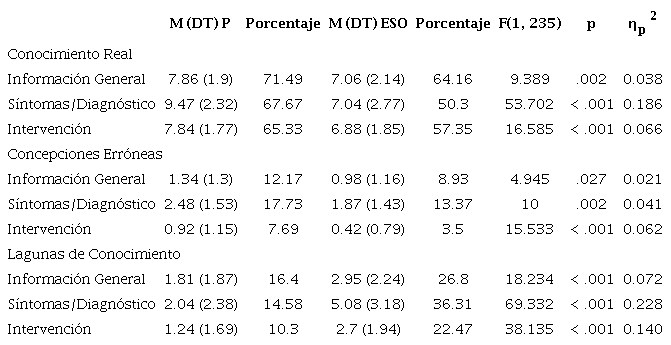Por último, las diferencias entre el profesorado de EP y ESO fueron estadísticamente significativas en las lagunas de conocimiento, F(1, 235) = 53.69, p < .001, ηp2 = 0.186, con un tamaño del efecto grande. En este caso, fue el profesorado de ESO (M = 10.73, DT = 6.48) quien mostró un mayor nivel de lagunas de conocimiento frente al profesorado de EP (M = 5.08, DT = 5.32). Con respecto a cada una de las dimensiones, los resultados reflejaron diferencias estadísticamente significativas en las lagunas de conocimiento en las tres dimensiones entre el profesorado de EP y ESO, con un tamaño del efecto medio para Información General y grande para Síntomas/Diagnóstico e Intervención (ver Tabla 2). Fue el profesorado de ESO quienes presentaron un mayor número de lagunas de conocimiento en las tres dimensiones de la escala.