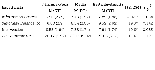 Los resultados de los ANOVAs reflejaron que las diferencias entre los distintos niveles de experiencia (ninguna-poca, media y bastante-amplia experiencia) se daban en las tres dimensiones de la escala, con tamaños del efecto pequeño en la dimensión de Información General, grande en la dimensión de Síntomas/Diagnóstico y medio en la dimensión de Intervención (ver Tabla 3).