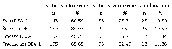 Además, se llevó a cabo un análisis de tipo descriptivo sobre las diferentes atribuciones causales del profesorado en cuanto al éxito y/o fracaso de alumnado con y sin DEA-L en base al nivel educativo. Se realizaron tablas de contingencia multidimensionales, con el fin de obtener las frecuencias totales de las atribuciones a factores internos, externos o combinación de ambos, con respecto al éxito y/o fracaso de alumnado con y sin DEA-L.
