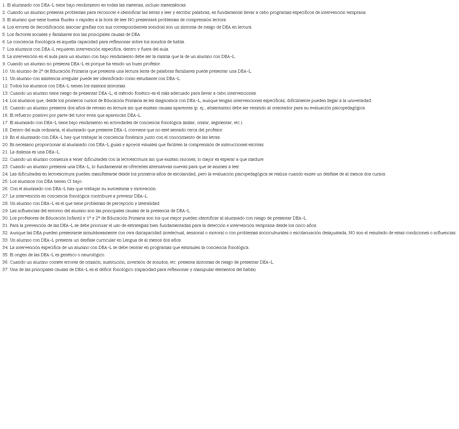 Washburn et al. (2017) llevaron a cabo un estudio sobre el conocimiento de las características de las DEA-L en general y la dislexia en particular, de 271 docentes de Estados Unidos con entre 0 y 5 años de experiencia. Sus resultados reflejaron que el 54% del profesorado mostraba conocimientos erróneos en relación con la dislexia, siendo este porcentaje mayor entre el profesorado equivalente a la ESO.