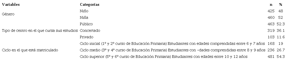 Cabe señalar que, como ya se anticipaba en la Tabla 1, los seis cursos de educación primaria han sido recodificados en tres categorías: ciclo inicial (1º y 2º curso), ciclo medio (3º y 4º curso) y ciclo superior (5º y 6º curso); existiendo una vinculación con la edad, ya que los estudiantes del ciclo inicial tenían edades comprendidas entre los 6 y 7 años, el alumnado matriculado en el ciclo medio ostentaba un rango de edad que oscilaba entre 8 y 9 años, mientras que los de ciclo superior tenían entre 10 y 11 años.