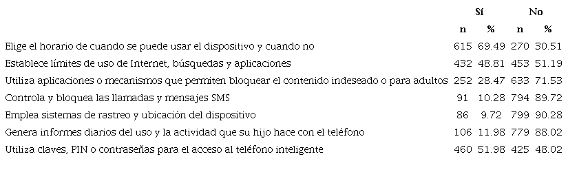 Como se aprecia en la Tabla 2, la Elección del horario sobre cuándo se puede usar el dispositivo y cuándo no (69.49%), la Utilización de claves, PIN o contraseñas para el acceso al teléfono inteligente (51.98%) y el Establecimiento de límites de uso de Internet, búsquedas y aplicaciones (48.81%) se erigen como los mecanismos de control parental que más padres y madres afirmaron usar.