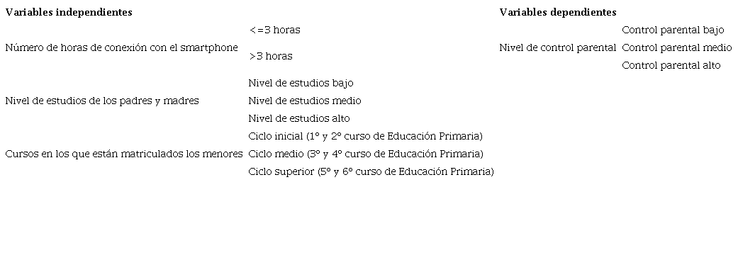 Como se ha mencionado en líneas previas, los menores acceden a los smartphones a una edad cada vez más temprana (Andrade et al., 2021; Rideout y Roob, 2020; Sola et al., 2019); sin embargo, la mayor parte de las investigaciones se centran en el estudio de la población adolescente (e.g., Andrade et al., 2021; Smahel et al., 2020). Asimismo, si bien en los últimos años se ha comenzado a analizar el papel que asumen las familias en la educación digital de sus hijas e hijos, lo cierto es que, comparativamente con otras líneas de investigación, los estudios todavía resultan exiguos. De este modo, a través del presente trabajo se pretende contribuir a mejorar el corpus teórico y la investigación referente a este campo. Concretamente, el propósito de este estudio ha sido identificar el tipo de medidas de control parental utilizadas por padres y madres respecto al uso que sus hijos e hijas en edad escolar (6 a 12 años) hacen del teléfono inteligente. Más específicamente, se han planteado los siguientes objetivos: 1) conocer el tipo de mecanismos de control parental empleados por padres y madres para regular el uso que sus hijos e hijas realizan con el teléfono inteligente, 2) analizar si el nivel de estudios de los progenitores está relacionado con el grado de control parental establecido con los menores respecto al uso que estos hacen del teléfono inteligente, 3) identificar si existe relación entre el número de horas diarias de conexión con el teléfono inteligente por parte de los menores respecto al nivel de control parental ejercido, y 4) evaluar si el curso de Educación Primaria en el que están matriculados los niños y las niñas es una variable que influye en el número de mecanismos de control parental utilizados por los padres y madres para la regulación del uso del teléfono inteligente.