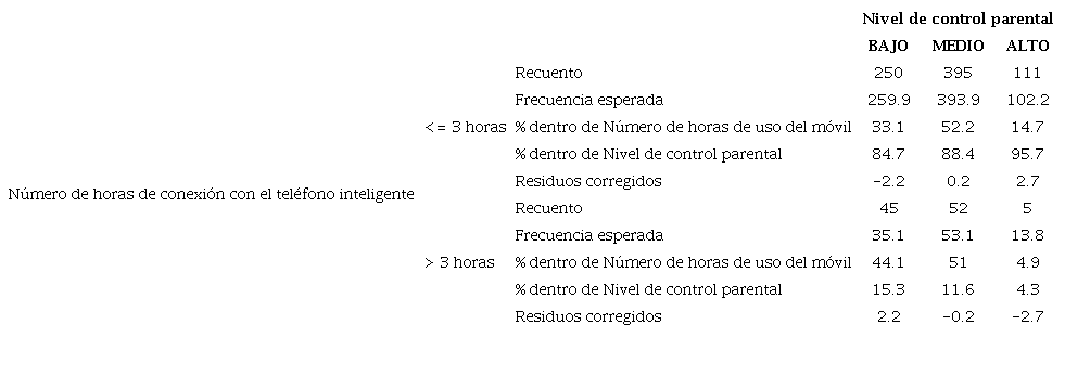 Respecto al Número de horas de conexión con el smartphone y al Nivel de control parental, los resultados señalan una relación significativa entre ambas variables, χ2(2) = 9.57, p = .008, siendo el tamaño del efecto bajo (V de Cramer = .106). Tal y como se aprecia en la Tabla 5, los niños y las niñas cuyos progenitores fueron más laxos al aplicar medidas de control parental de perfil bajo tendieron a utilizar sus teléfonos inteligentes durante más de tres horas diarias, frente a aquellos otros menores con padres y madres que utilizaron un elevado número de mecanismos de control parental.