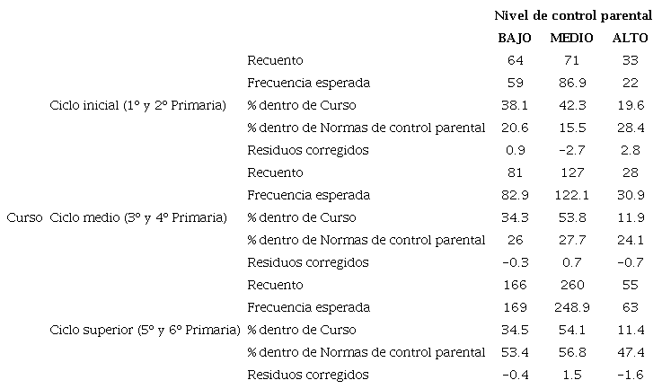 Por último, referente al curso en el que están matriculados los menores, se hallaron diferencias estadísticamente significativas respecto al nivel de control parental χ2(4) = 10.906, p < .05, existiendo un tamaño del efecto bajo (Gamma = -.021). Como se observa en la Tabla 7, los padres y las madres aplicaron un mayor número de mecanismos de control parental con hijas e hijos preadolescentes, matriculados en los últimos cursos de Educación Primaria (5º y 6º).