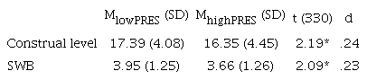 Table 1 shows that participants that perceived themselves in greater PRES presented lower construal level (i.e., a more concrete mindset) and lower level of SWB. These results supported hypotheses 1 and 2 respectively.