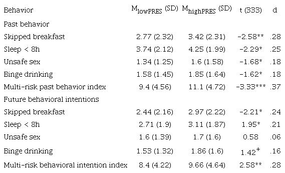 Risk behaviors. Participants reported the frequency of their past behavior (the previous six months) and their future behavioral intentions (the following year), on the following risk behaviors: binge drinking, condomless sex (unsafe sex), skipped breakfast, sleep debt (sleeping less than 8 hours per day for leisure). Responses ranged on a 7-point Likert scale from 1 = Not at all to 7 = Very much.