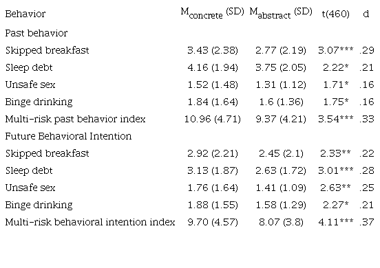 First, results revealed that the relatively more abstract group presented the lowest levels of past and future risk behaviors (see Table 3).