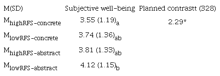 Regarding SWB, the 1 versus 3 contrast showed that adolescents with high PRES that presented a more concrete mindset reported the lowest level of SWB (see Table 4). The abstract mindset seems to reduce the differences in SWB between high and low PRES groups. Results supported hypothesis 5.