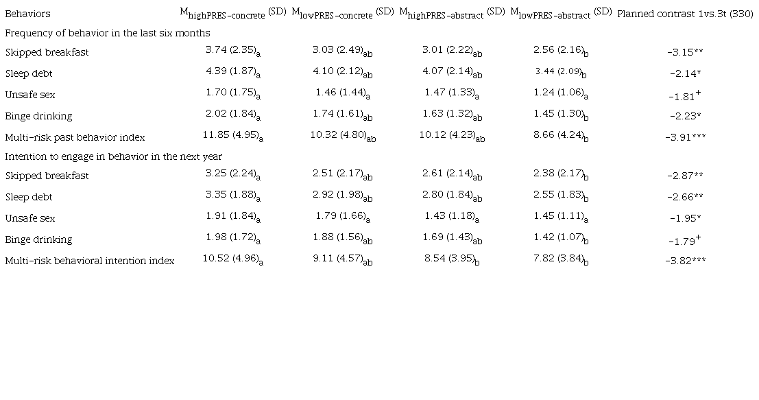 Then, we repeated the post-hoc (Bonferroni test) and planned comparisons (high PRES-concrete mindset vs. other conditions as a whole) on past behaviors, future intentions, and multi-risk indexes. Results are shown in table 5.