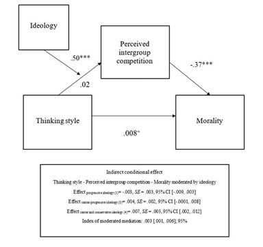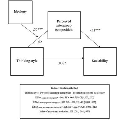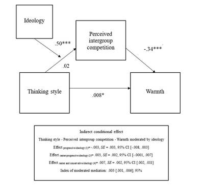 Results support a direct effect of thinking style on stereotype, and then, as we expected, the results support an indirect (through the perceived competition with the outgroup) and conditional (depending on ideological orientation) relationship between thinking style and stereotype.