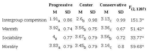 To examine the effect of ideology on the rest of the variables, we divided the scores into three levels: 1-3 (progressive, n = 770, 63.74%), 4 (center, n = 278, 23.01%), and 5-7 (conservative, n = 160, 13.25%). Napier and Luguri (2013) justify this division when the sample is biased toward one of the ideological poles. Through analysis of variance, we compared the scores of the warmth component and its dimensions, morality and sociability, among the three ideological groups. Post-hoc comparisons were made among the three ideological groups using the Tukey-b test. Results showed that the most conservative people present a more negative stereotype of immigrants both in terms of global warmth and the subdimension of morality; there are statistically significant differences between the three ideological groups. Sociability follows the same direction, however the difference between the center and conservative groups is not statistically significant. Likewise, significantly higher scores were obtained for perceived intergroup competition for participants with more conservative ideologies (Table 2).