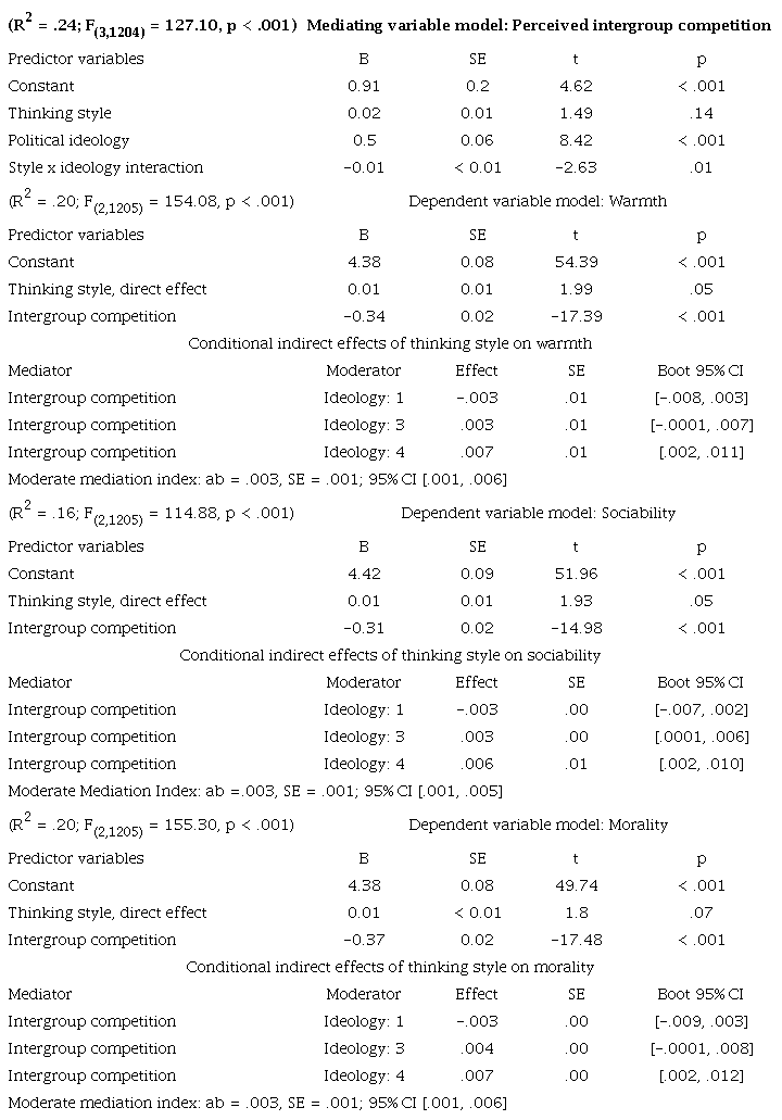 This indirect conditional relationship between thinking style and stereotype was tested in three moderated mediation analyses, one for each dependent variable analyzed: the warmth dimension of stereotype and its two facets, sociability and morality.
