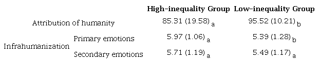 We also conducted ANOVA with the explicit and implicit measures of dehumanization. Analysis of responses to the Ascent of Human Scale resulted in a significant difference as a function of inequality (F(1,243) = 8.27; p = .004; η2p = .033) as the high inequality group was considered less human (M = 85.78; SD = 18.86) than the low inequality group (M = 91.56; SD = 11). In parallel, the 2 (Inequality: High vs. Low) x 2 (emotion attribution: primary vs. secondary) ANOVA yielded two main effects: the one corresponding to inequality level (F(1,243) = 7.61; p = .006; η2p = .030) and the one corresponding to emotion type (F(1,243) = 5.16; p = .024; η2p = .021; see mean scores in Table 1).