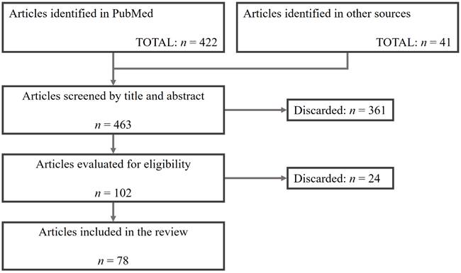 Figure 1 represents a synthesis of the article search and selection process. From a total of 463 articles identified, 361 were discarded through a screening process that involved reading the title and abstract. The remaining 102 articles were evaluated for eligibility by reading their content in full, and 24 were discarded because they did not provide relevant information for the present work or because they did not fully satisfy the established criteria.