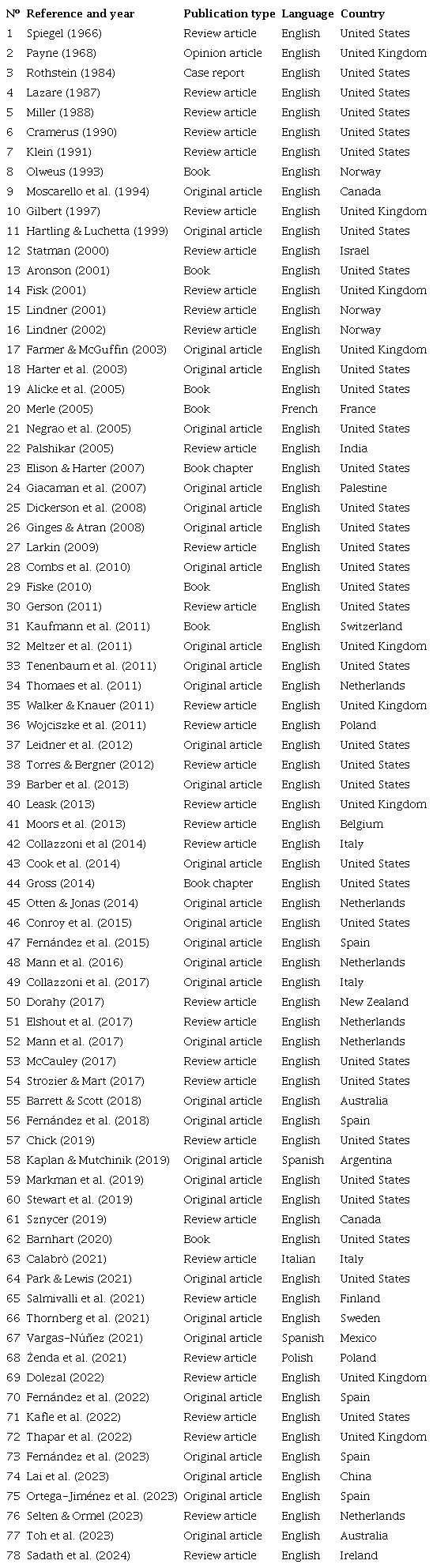 The methodology used corresponds to the narrative review (Sukhera, 2022). Data collection was managed by the first author between December 15 (2023) and February 15 (2024). The main database examined was PubMed, although the bibliographic sources PsycInfo, Dialnet, Latindex, Academia, JSTOR, and ResearchGate were also used. The established exclusion criteria were: 1) articles not available or not accessible; 2) articles that do not contain information related to the objectives of the study, or whose subject matter is not relevant to their achievement. The following inclusion criteria were set: 1) articles about humiliation; 2) articles about other emotions closely related to humiliation (shame and anger); 3) articles on self-conscious emotions that discuss social and clinical implications; 4) articles on bullying/harassment that consider humiliation as a variable; 5) articles on specific contexts that harbor victimization dynamics potentially mediated by humiliating acts; 6) theoretical articles that expose models related to the cognitive appraisal of the situation, emotional regulation, and/or social judgments and attributions. To carry out the search, different combinations were used with the following keywords and Boolean operators: («humiliation») AND («bullying» OR «harassment» OR «mistreatment») AND («shame» OR «anger») AND («social» OR «health») AND («consequences» OR «effects»). Likewise, the search process involved the recognition of several reference lists of studies related to the topic investigated, as well as the examination of book reviews present in the bibliographic sources consulted. No search restrictions were applied, nor was an inter-rater reliability procedure carried out. Articles in languages other than Spanish and English were examined with the help of online translation tools.