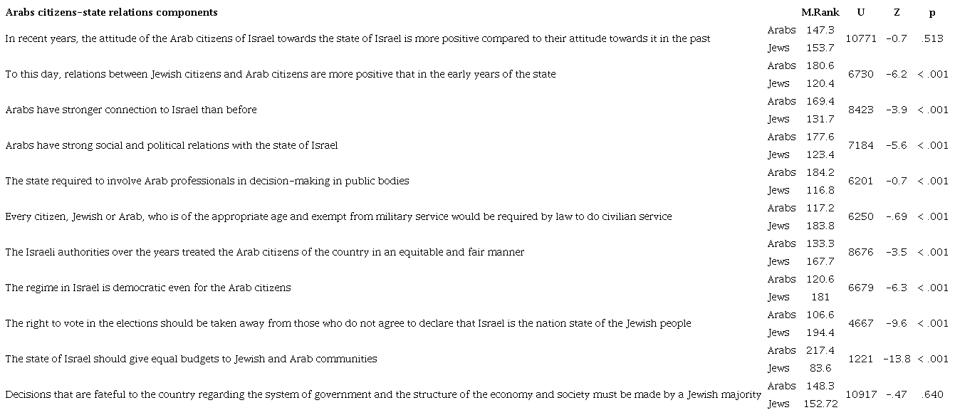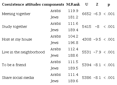 In the same way, it was carried out a Mann Whitney U test to check differences in coexistence attitudes components scores between Arab and Jews teachers. The results revealed significantly higher willingness of Jew teachers compared to Arab to meet with the other, study together, host him, be roommates, be friends, and share social media together. According to these findings, it can be argued that Jews teachers are characterized by a distinctly higher willingness than Arab teachers for coexistence (Table 2).