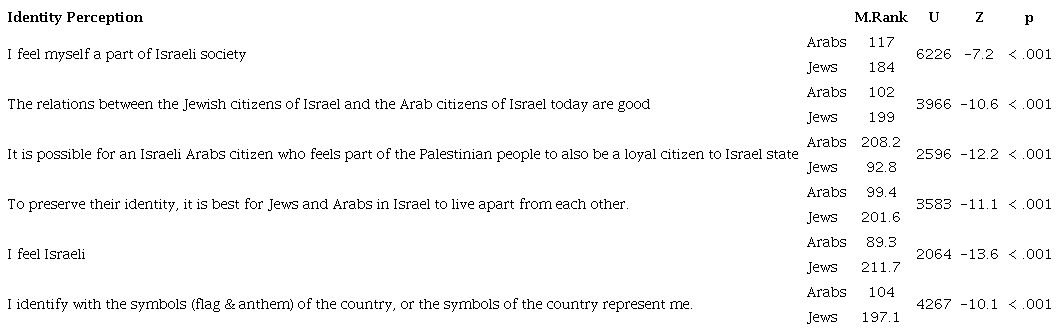A second U Mann Whitney test conducted to test differences in identity component scores between Arab and Jewish teachers. The result of this U Mann Whitney test is presented in Table 3, and it indicates significant differences between Jewish and Arab teachers in terms of the sense of belonging to Israeli society, perception of the relationship between Jews and Arabs, preserving national identity, sense of Israeliness, and in terms of the hints and symbols of the state, with higher mean values for Jewish teachers. In the case of loyalty to the state on the part of Israeli Arabs who feel part of the Palestinian people, there are statistically significant differences, but it is the Arab teachers who obtain higher values.